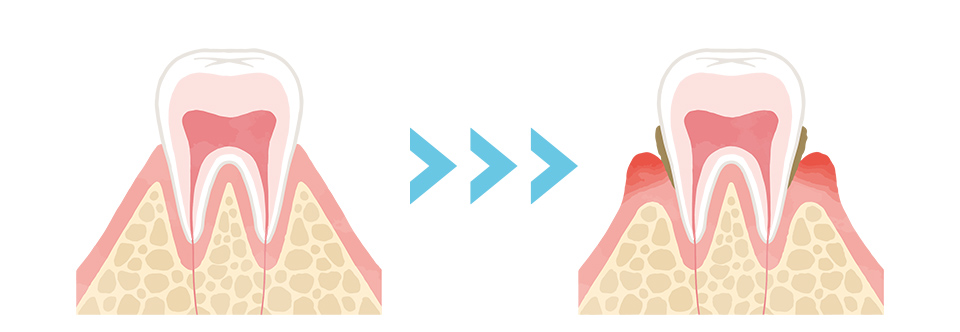 歯と歯肉の境目にプラークや歯石が溜まり続けてしまうと、そこに多くの細菌が停滞し歯肉の辺縁が炎症を起こして赤くなったり、腫れたりします。
